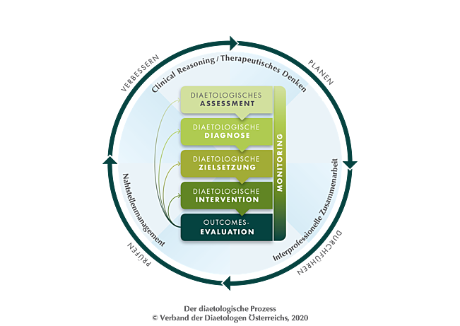 Die qualitätssichernden Maßnahmen (Dokumentation, Prozessevaluierung und Reflexion) des diaetologischen Prozesses dienen zur Sicherstellung der Behandlungsqualität und der Behandlungskontinuität und einer kontinuierlichen Verbesserung im Sinne des PDCA-Zyklus. Der PDCA-Zyklus integriert neben dem eigentlichen Prozess, strukturelle Rahmenbedingungen und Anforderungen, wie z.B. Ressourcen, Kompetenzen und Qualifikationen, Gesetze, Berufsethik, Leitlinien, Beratungsstandards (Prozess-INPUT), genauso wie die Dokumentation und die Therapieberichte (Prozess-OUTPUT).